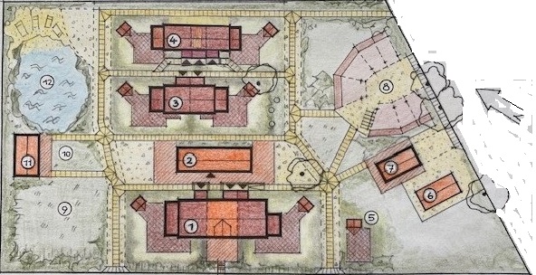 8 = Carportanlage 7 = Heizhaus 6 = Holzlagerschuppen 5 = Terrassenhäuschen |