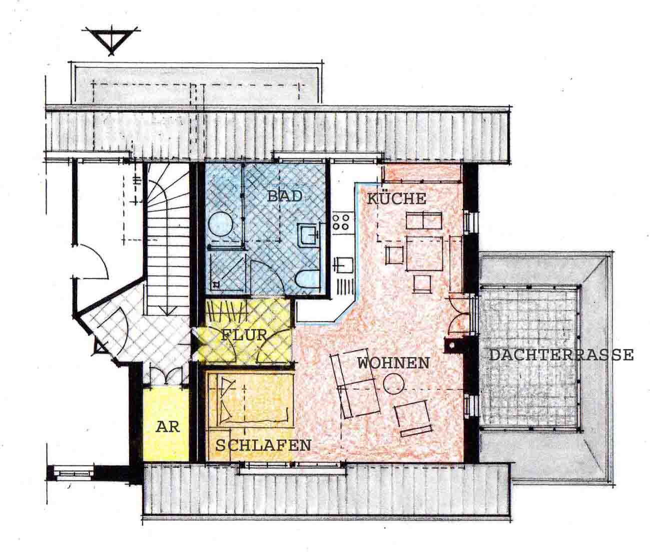 Sie verfügt über Flur, Bad, Wohnzimmer und einen kleinen Schlafraum, sowie eine zum Wohnzimmer hin offene Küche und einen kleinen Abstellraum. Vom Wohnzimmer führt eine Außentür auf die Dachterrasse über der Erdgschosswohnung. Der Wohnungszugang erfolgt über eine Treppe, die auch zur Bibliothek führt. Vom oberen Treppenausgang geht es nach links in die Wohnung, geradeaus zu dem zur Wohnung gehörenden Abstellraum und nach rechts in die Bibliothek. Zu der Wohnung gehört, wie zu den anderen Wohnungen auch, ein Gartenanteil mit einem . Terrassenhäuschen zur Unterbringung der Geatrnmöbel. Die Wohnung verfügt über einen Schornstein, der den Anschluß z.B. eines Kaminofens erlaubt. |