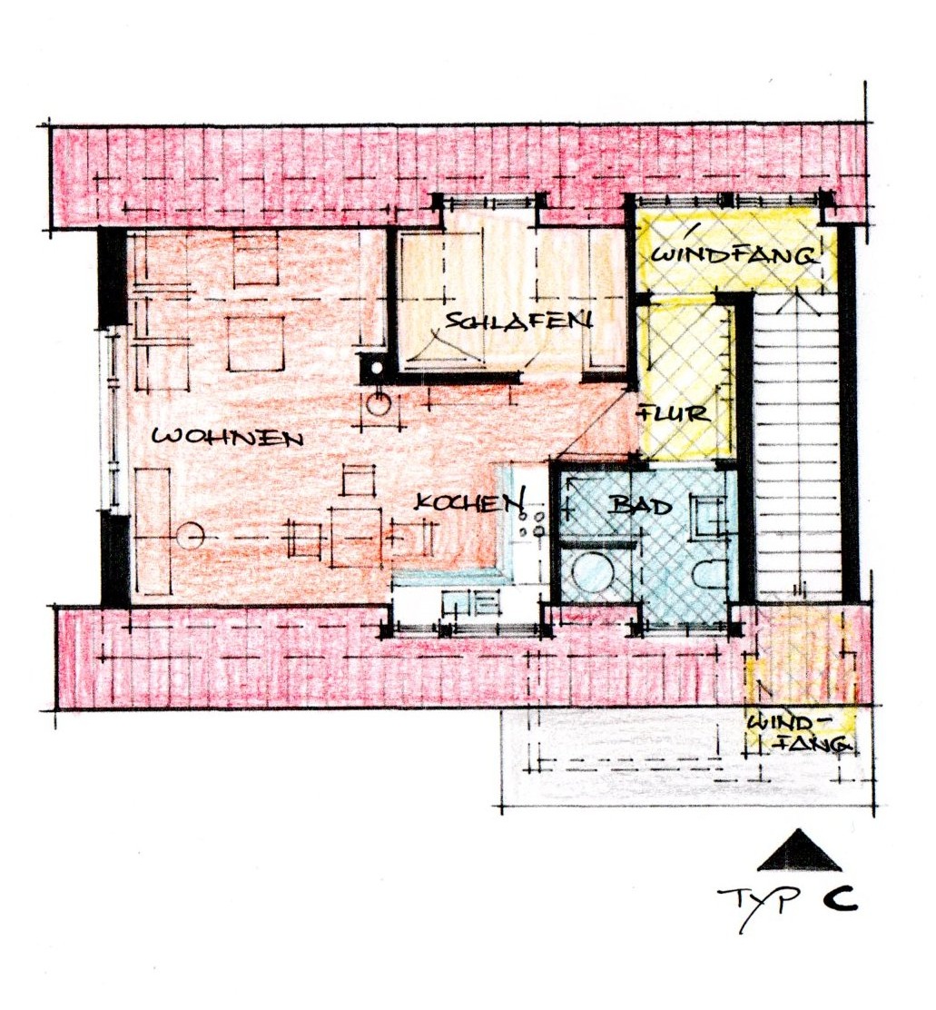 Hier ist der Eingangsbereich mit einer Treppe mit der Diele im Dachgeschoss verbunden. Im nachgeschalteten Wohnbereich befinden sich das Wohnzimmer mit dem Koch- und Essplatz, das Schlafzimmer und das Bad.